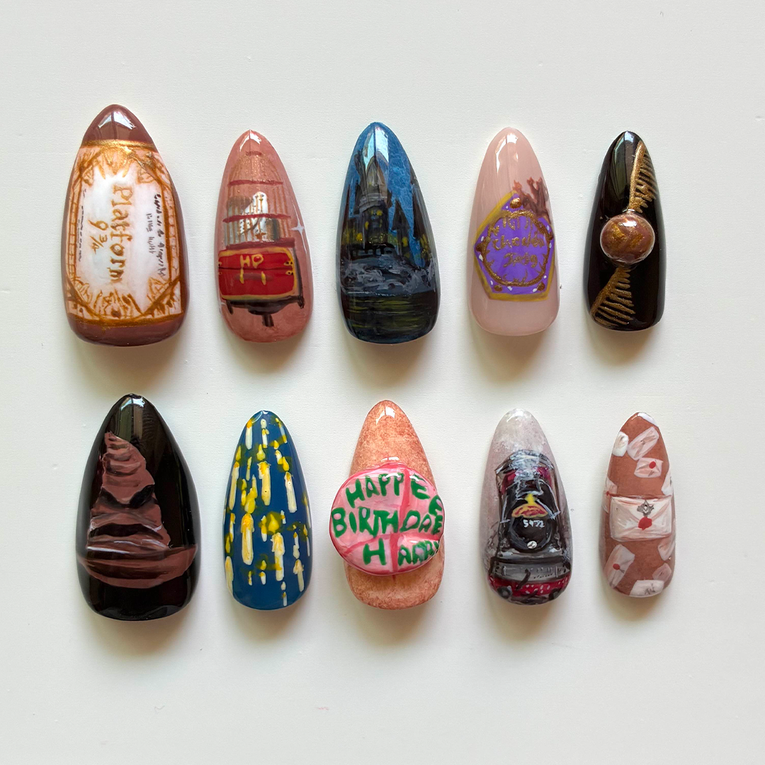 Each order includes 10 hand-painted nails, a mini buffer, nail file, nail glue, 24 sticky tabs, alcohol wipes, a wooden cuticle pusher, and an instruction manual on how to apply!